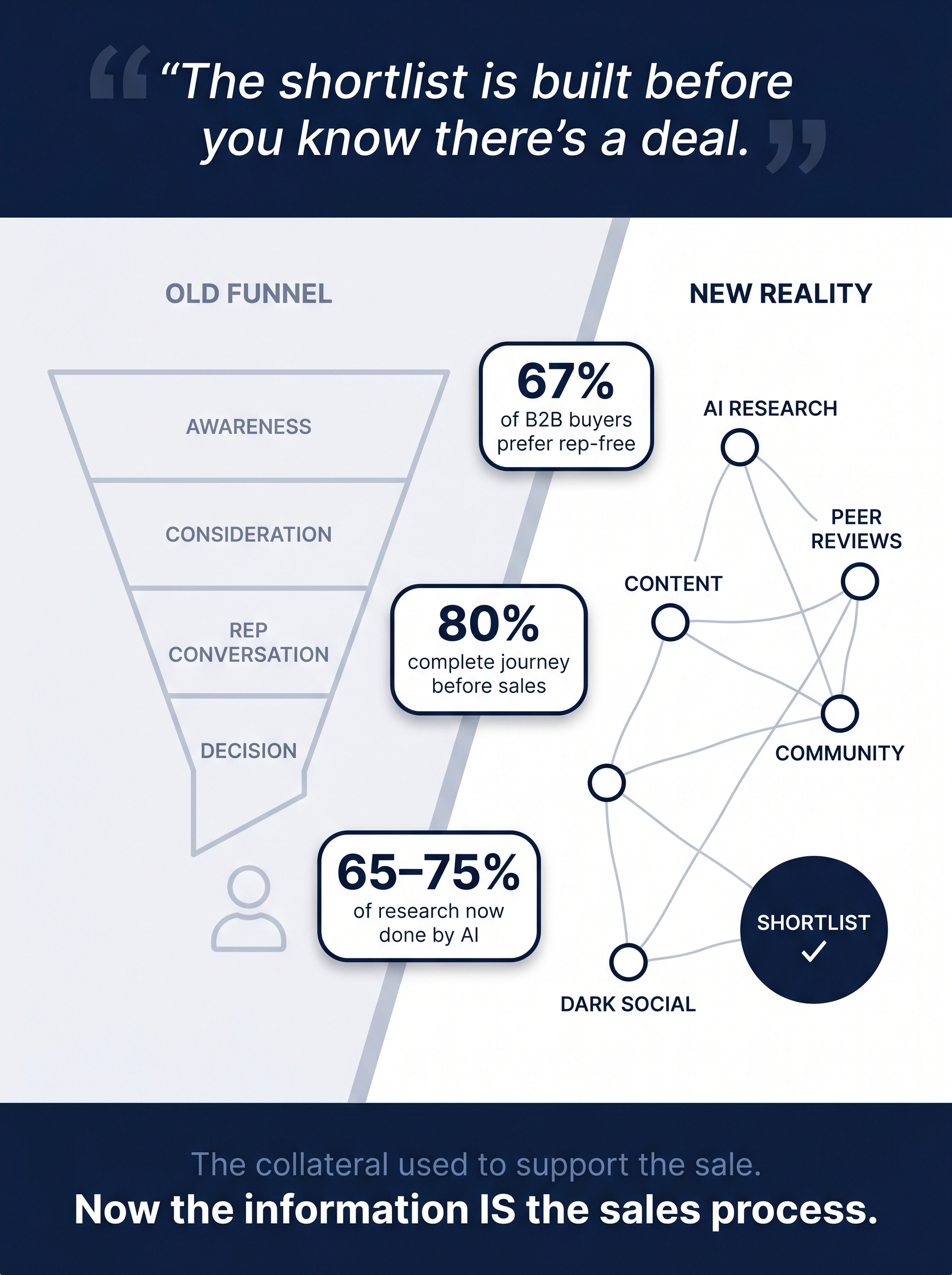 AI now covers 65-75% of that independent research. Pedowitz Group. The shortlist is being built in 10 minutes inside ChatGPT, with no human involved.