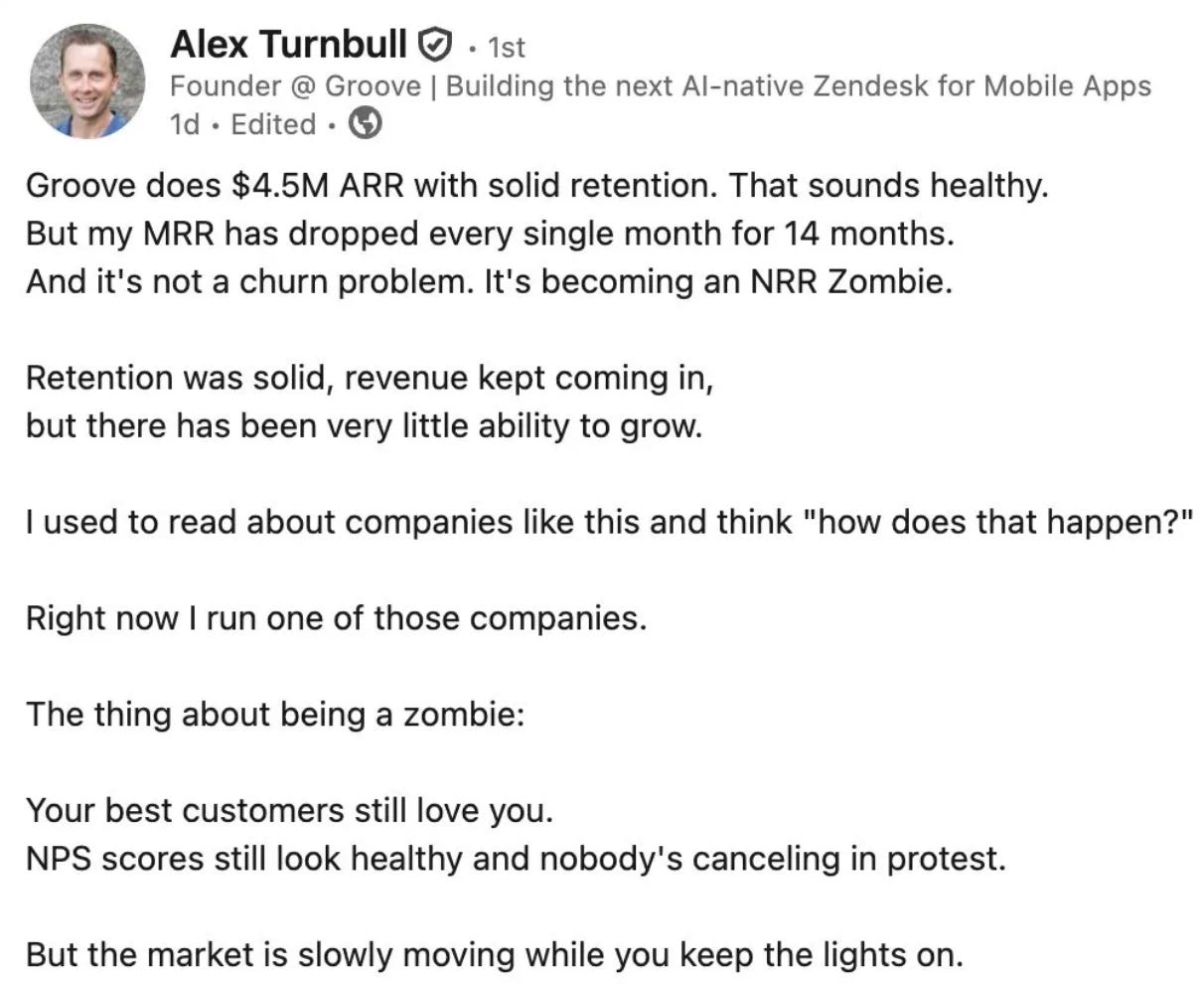 Last issue I pulled a quote from Alex Turnbull at Groove. He called his company an “NRR zombie” — $4.5M ARR, solid retention, healthy NPS, and MRR down every single month for 14 months.